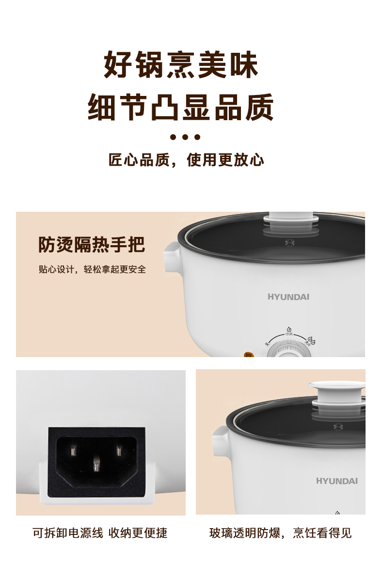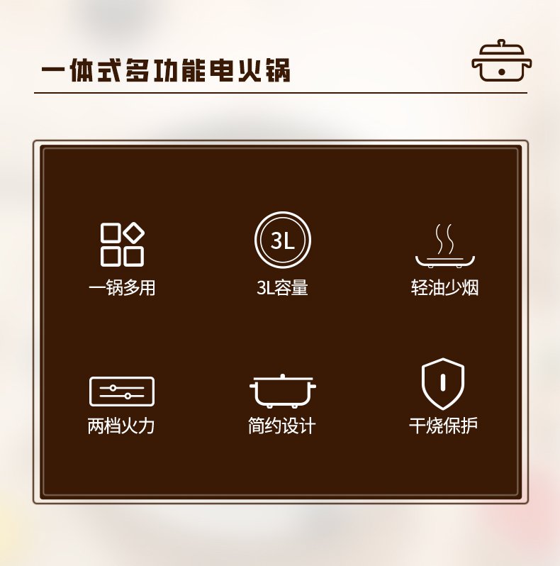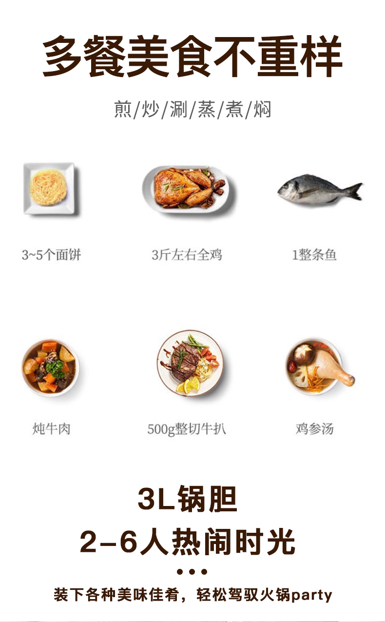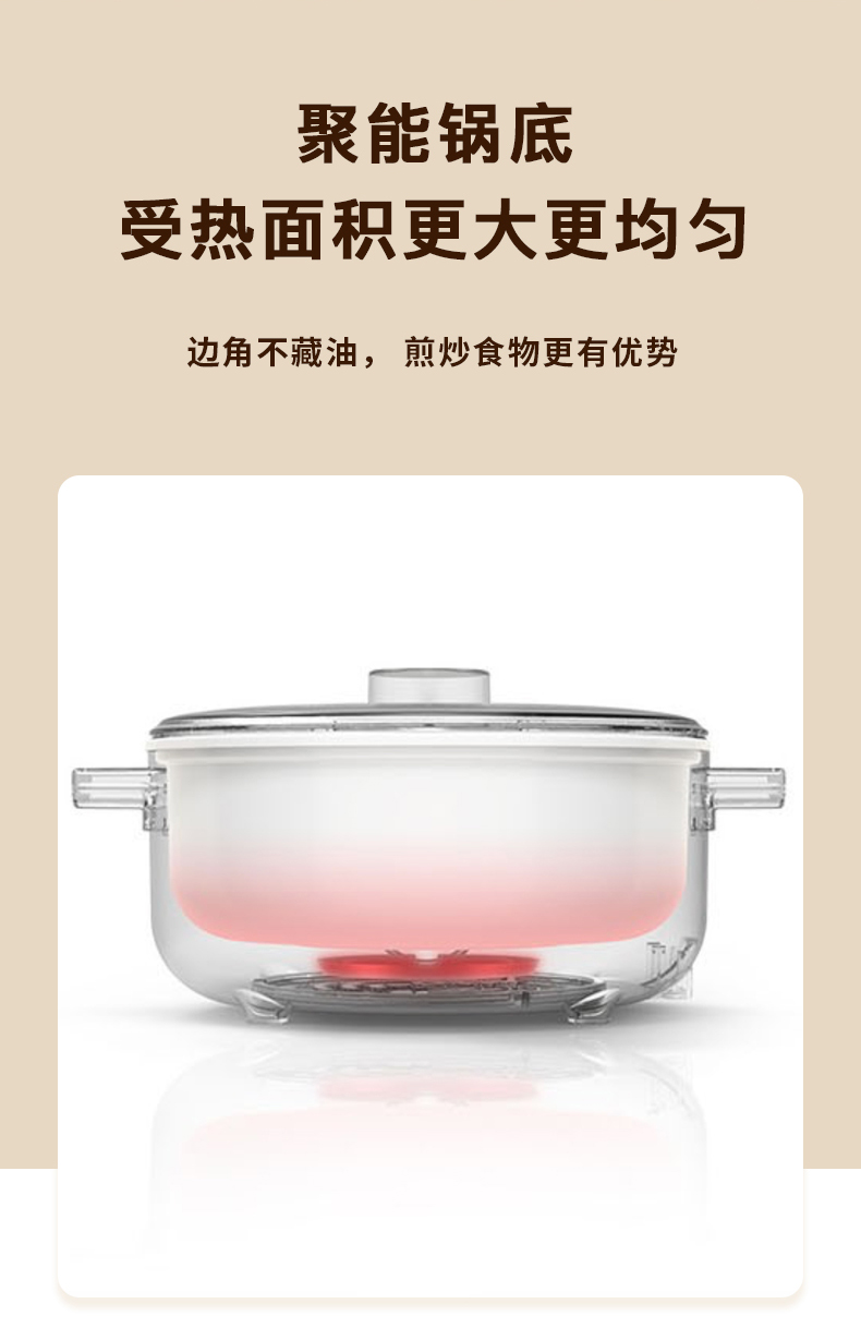 1、3L大容量深鍋,兩檔火力調控,輕松掌控火力; 2、可視化玻璃蓋,烹飪狀態隨時可見 3、不沾涂層,輕油少煙,易清洗 4、防干燒保護,高溫/干燒自動斷電; 5、隔熱大手柄,輕松拿起更安全 6、可拆卸電源線插孔,硅膠防滑腳墊。