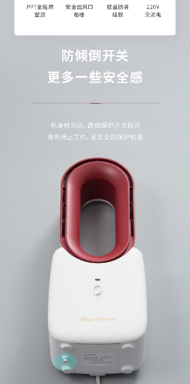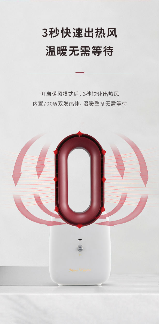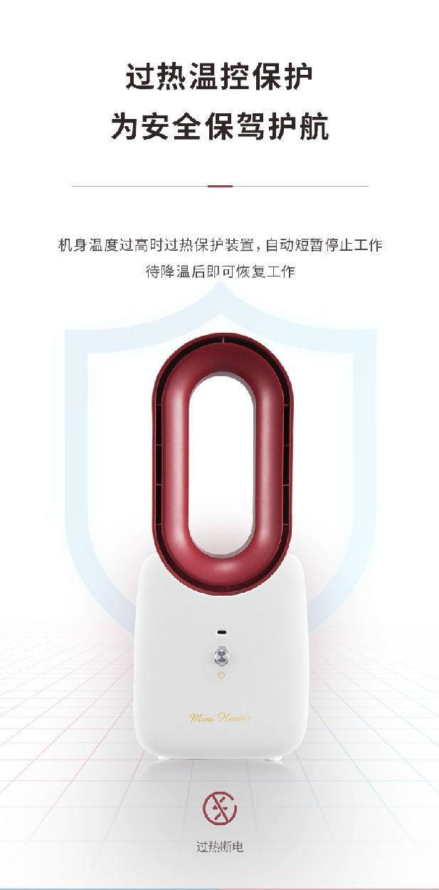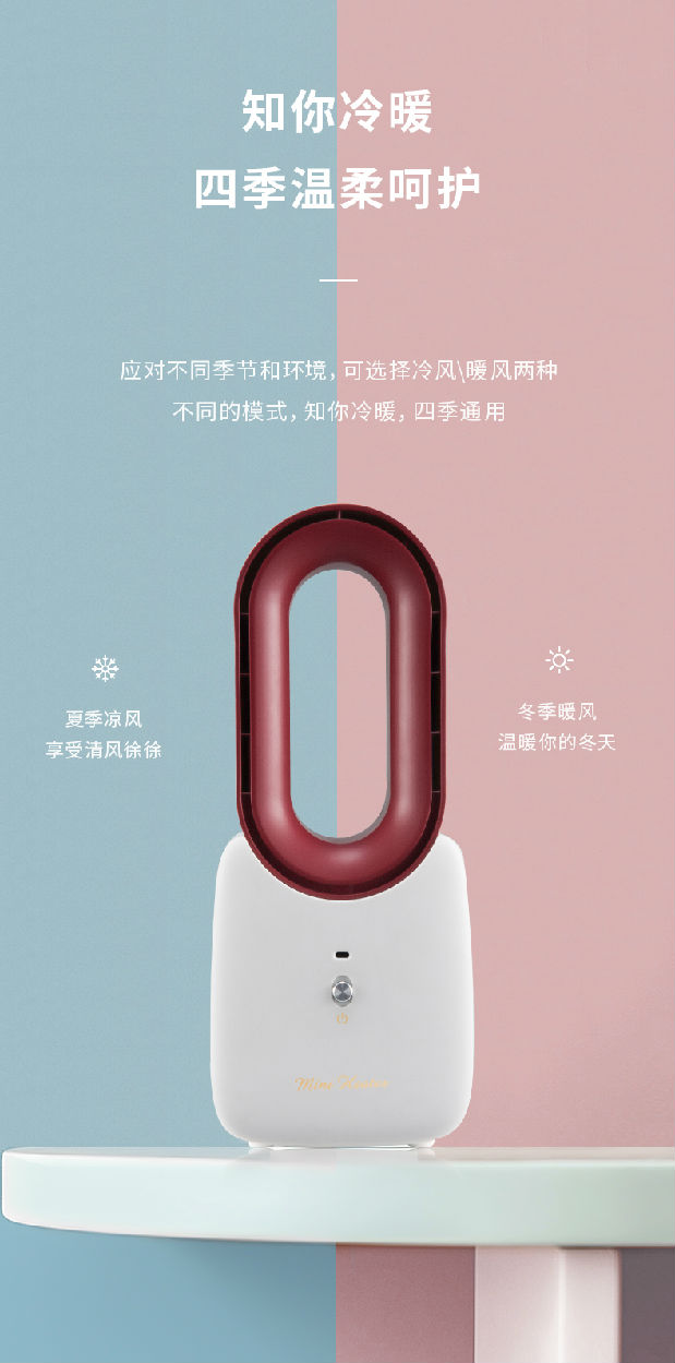 (1)無葉送風,冷暖兩用,冬暖夏涼,四季適宜。 (2)控制簡單便捷,傾倒安全開關保護。 (3)全阻燃塑膠機身設計,3秒快速出熱風 (4)高溫保護等