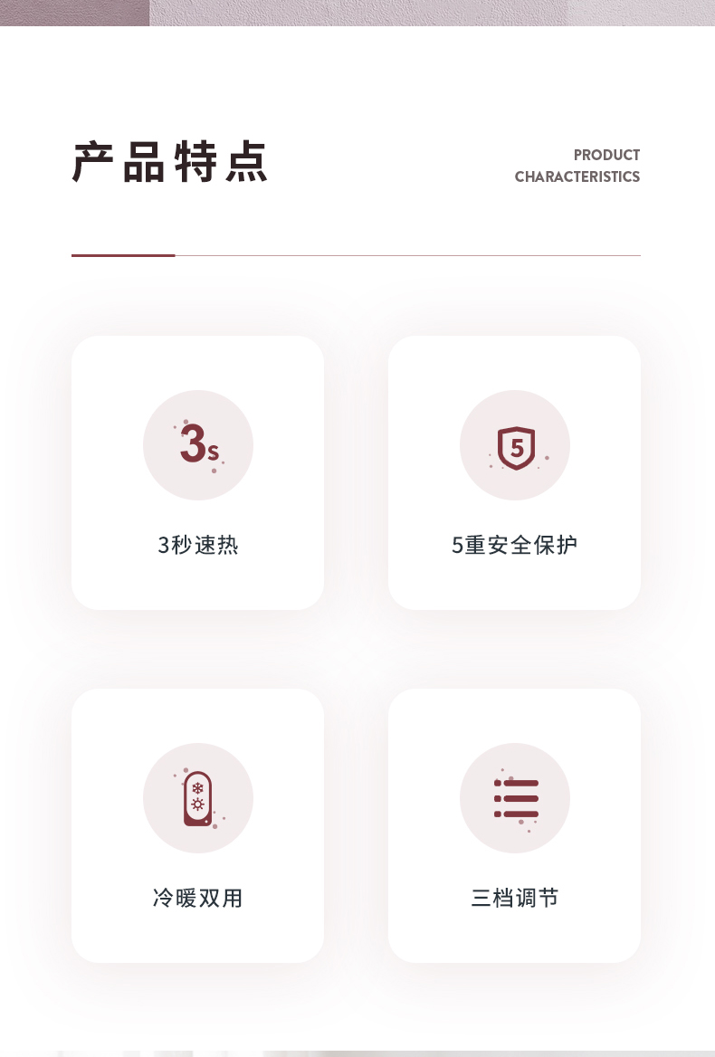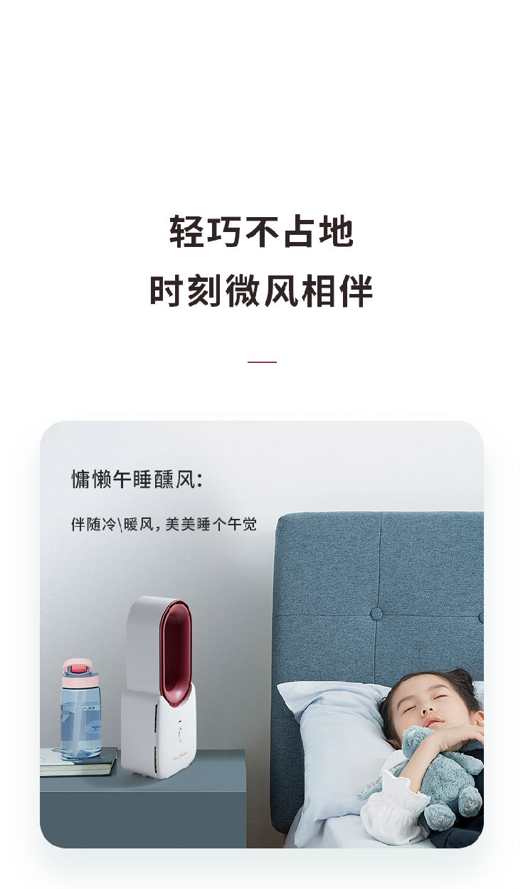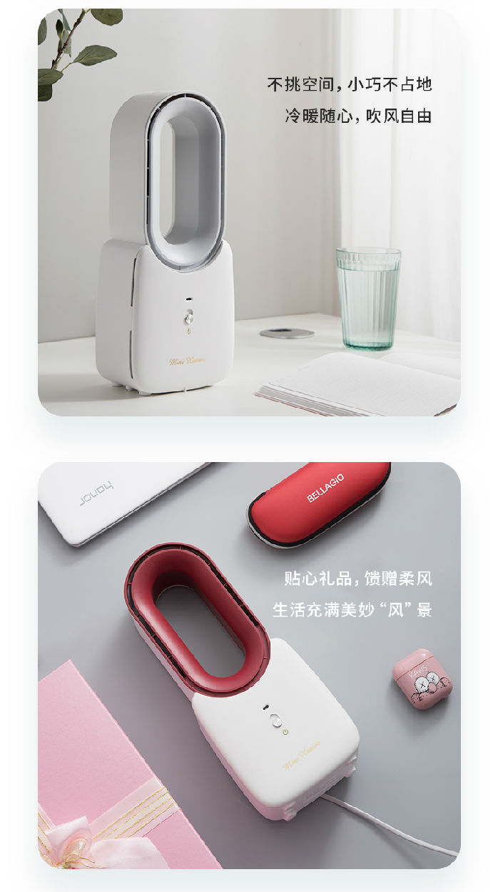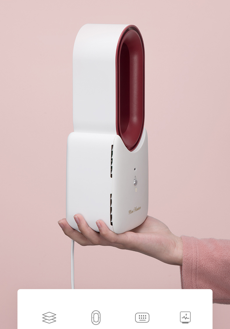 (1)無葉送風,冷暖兩用,冬暖夏涼,四季適宜。 (2)控制簡單便捷,傾倒安全開關保護。 (3)全阻燃塑膠機身設計,3秒快速出熱風 (4)高溫保護等