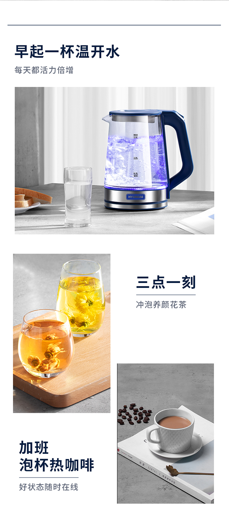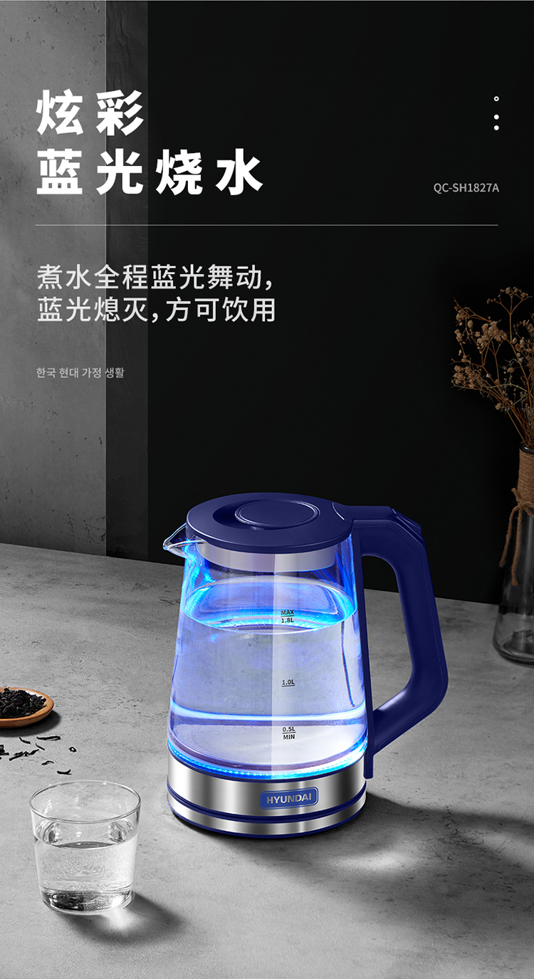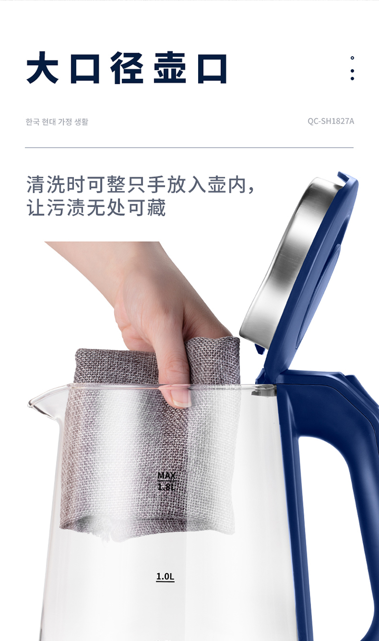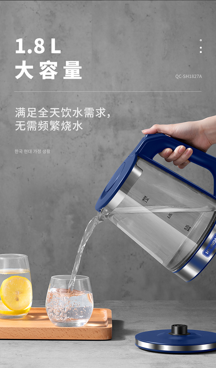1、一鍵加熱,煮水帶藍光,操作簡單快捷,狀態一目了然; 2、1.8L大容量,無論是家庭還是辦公室使用,滿足多種需求; 3、人性化設計,全景開蓋,清洗無憂; 4、壺身高硼玻璃打造,安全無錳呵護健康; 5、精密溫控,充分沸騰拒絕半生水; 6、防燙手柄,一鍵操作安全放心; 7、防干燒底座,自動斷電,防護更耐用。