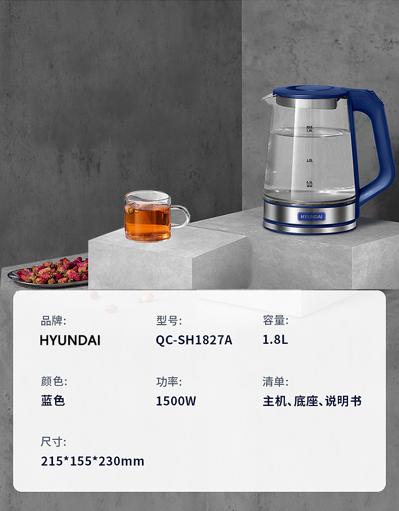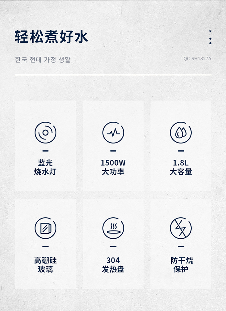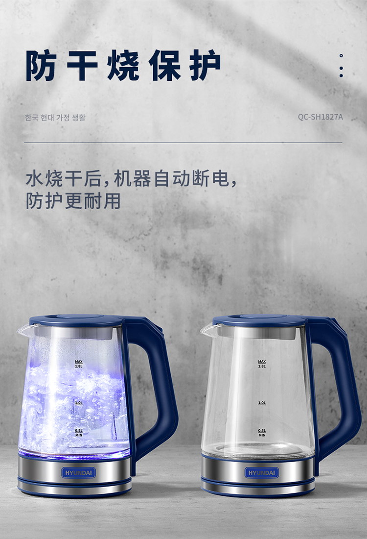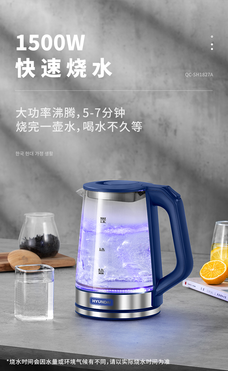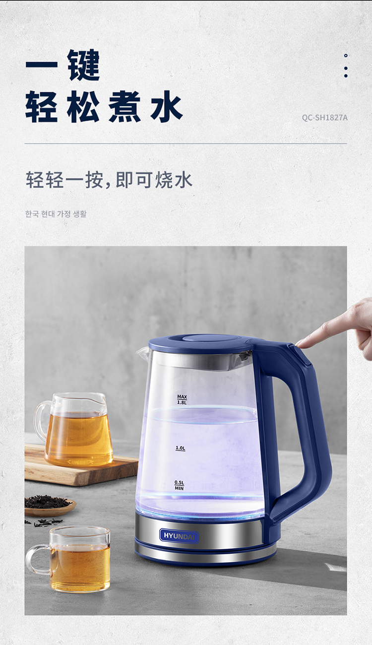 1、一鍵加熱,煮水帶藍光,操作簡單快捷,狀態一目了然; 2、1.8L大容量,無論是家庭還是辦公室使用,滿足多種需求; 3、人性化設計,全景開蓋,清洗無憂; 4、壺身高硼玻璃打造,安全無錳呵護健康; 5、精密溫控,充分沸騰拒絕半生水; 6、防燙手柄,一鍵操作安全放心; 7、防干燒底座,自動斷電,防護更耐用。